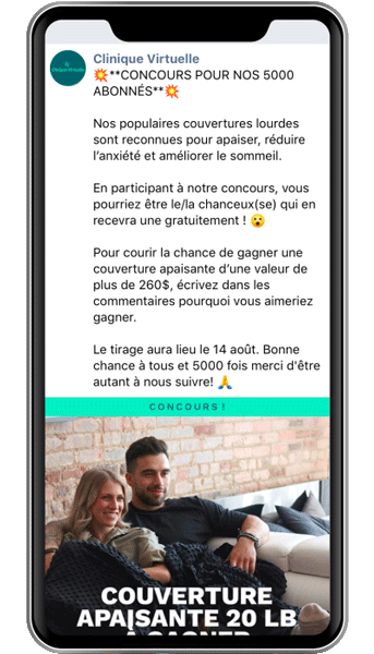 Pour La Clinique Virtuelle, le premier défi était de partir de zéro en publicité Facebook, sans historique ni données exploitables. L’absence de pixel et de tracking compliquait la création d’audiences pertinentes et la mesure de performance. Il fallait donc bâtir une structure publicitaire solide tout en trouvant une approche efficace pour promouvoir des produits liés à des dates de livraison spécifiques. Un autre enjeu majeur était de maximiser les ventes du produit vedette, les couvertures apaisantes, tout en maintenant un ROAS supérieur à 5, condition essentielle pour assurer une croissance rentable et durable.
