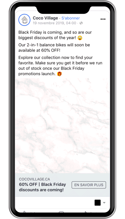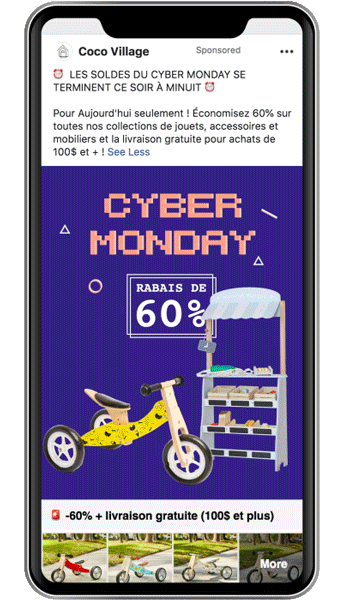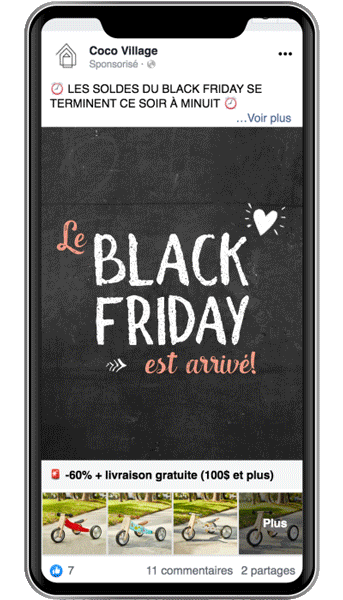 Afin de réchauffer nos futures audiences de Black Friday, nous avons utilisé quasiment 2 publicités par type de produit (ex. : vélo, lit, sac de couchage, etc.). Nous avons utilisé très souvent le duo carrousel/animation, de cette manière Facebook a toujours deux éléments à tester par audience.