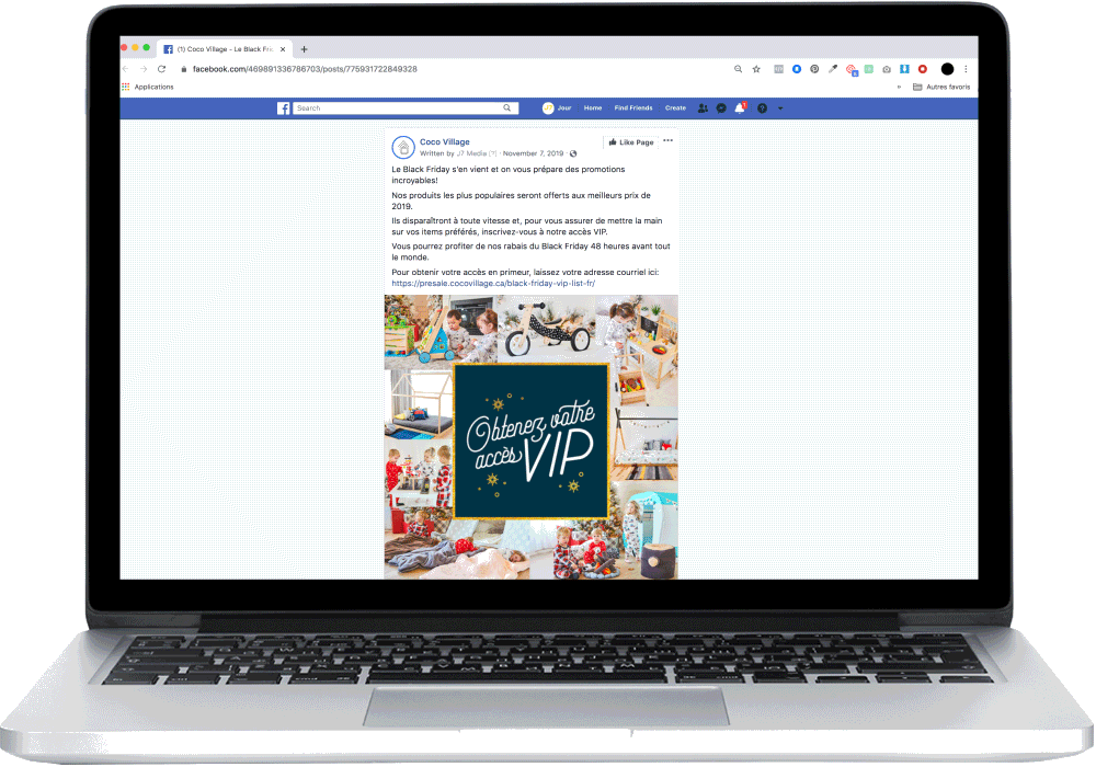 La vente sur internet ne se limite pas à Facebook. De plus en plus, l’emailing entre en jeu pour déclencher l’achat. C’est pourquoi nous avons créé une Liste VIP qui offrait un accès aux promotions du Black Friday avant tout le monde. Ce lead a donc deux fois plus de valeur qu’un concours avec opt-in. La personne s’est inscrite pour consommer nos produits et s’attend à recevoir des courriels de promotion.