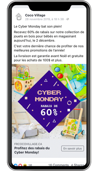 Vous remarquerez la différence au niveau du design entre toutes les publicités présentées du Pré-Black Friday au Cyber Monday. De cette façon, nous gardions un aspect nouveau pour le prospect.