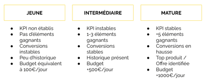 Maintenant qu’on a expliqué ces 3 niveaux de maturités en Facebook Ads, vous devez être en mesure de vous positionner et, ainsi, de suivre la structure pour tester ensuite.