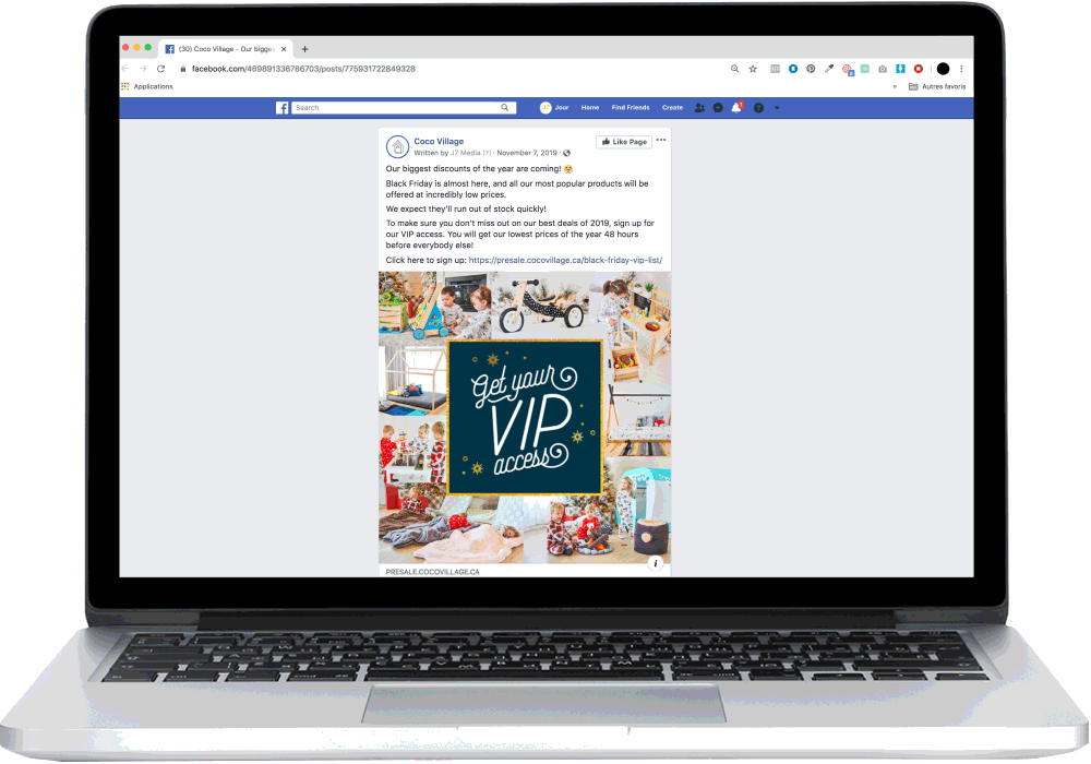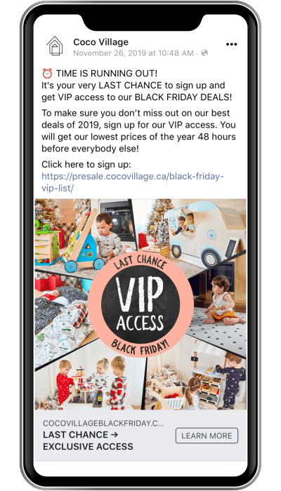 For Black Friday, Coco Village has asked us to maintain a strong return on investment by increasing its budget to $100,000 per month, which is double what it spent during the other months of the year.