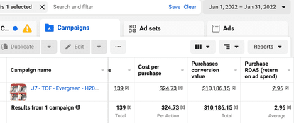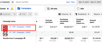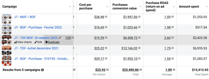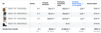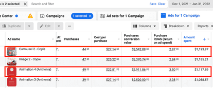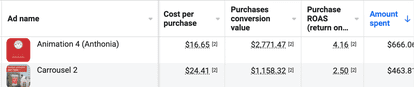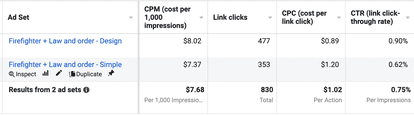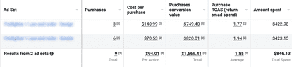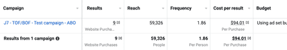 In this ABO campaign, we used the same two audiences and the same budget. We chose to advertise the best-selling products to ensure that we would generate a minimum number of purchases (we are testing the advertising approach after all, not the product).