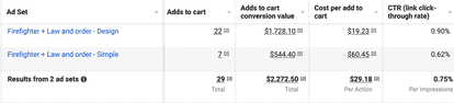 The Design ads also generated more add-to-carts (for 3x less money), but the average cart value is the same for both segments.