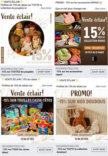 -15% on all blankets, -15% on all puzzles, -15% on dining accessories, -15% on all dolls