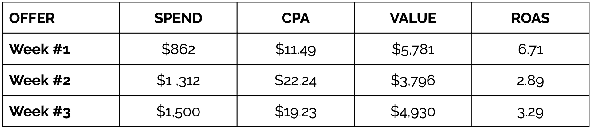 This test is interesting because we gained two things. First, knowledge of our market. Offer #1 worked very well, so we know we can use this range of products for future campaigns and offers. In terms of sales, Offer #3 comes in second place. Lastly, although Offer #2 generated a ROAS of almost 3, it is our weakest campaign for the moment. We know that alone, this offer wouldn’t be able to convince prospects to purchase a bundle. It would be too risky to lead with this campaign.