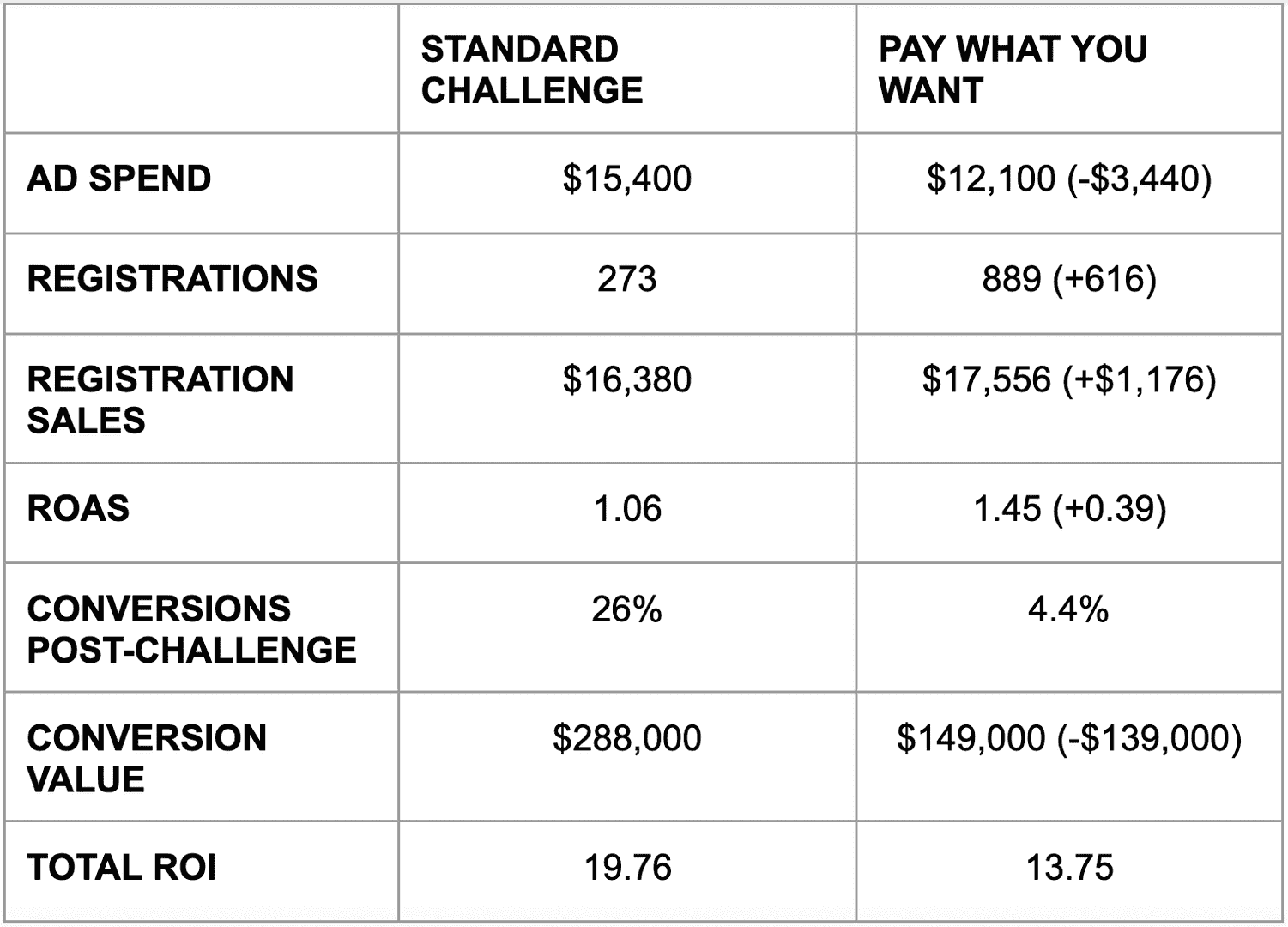 We're talking about Challenges again today because we tested a brand new formula. Instead of charging $60, we asked participants to pay the amount they wished to pay. So 'Pay What You Want.' The whole funnel, afterward, remained the same.