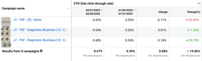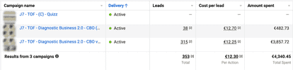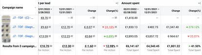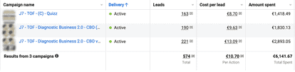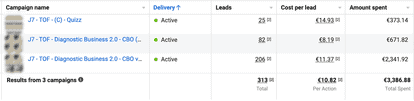 A 1800€ increase in spend, and a 13% decrease in CPL. Interestingly, the Quiz campaign also benefited the rest of the account, as we can see from the second campaign.