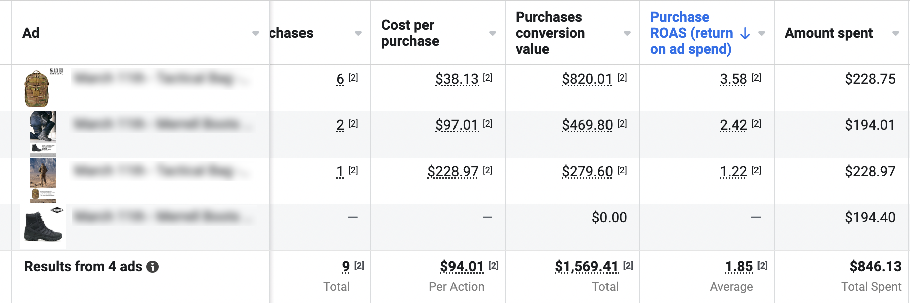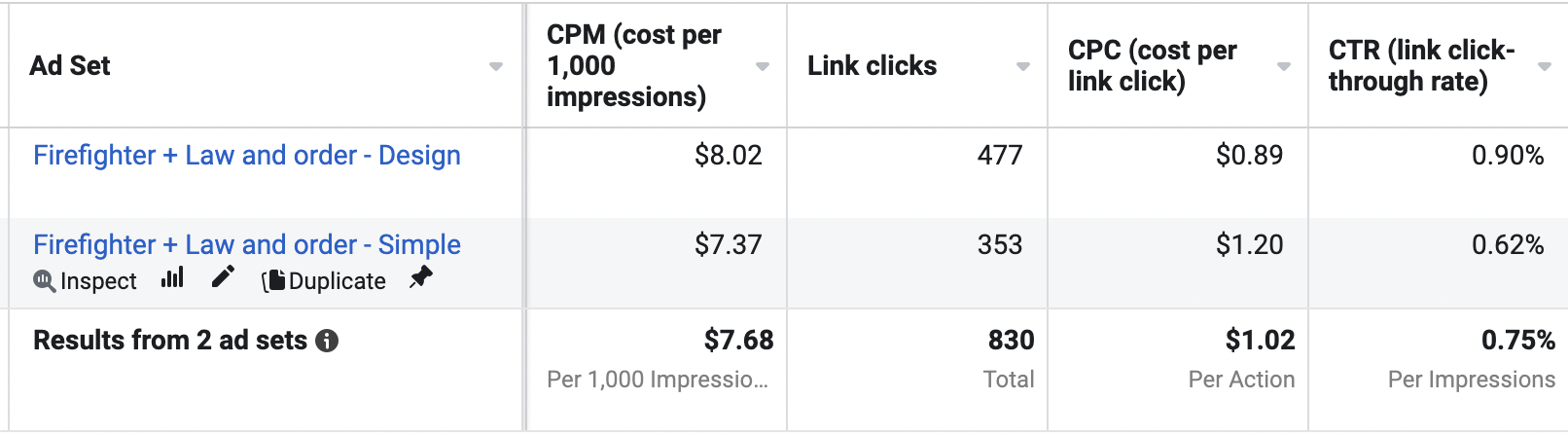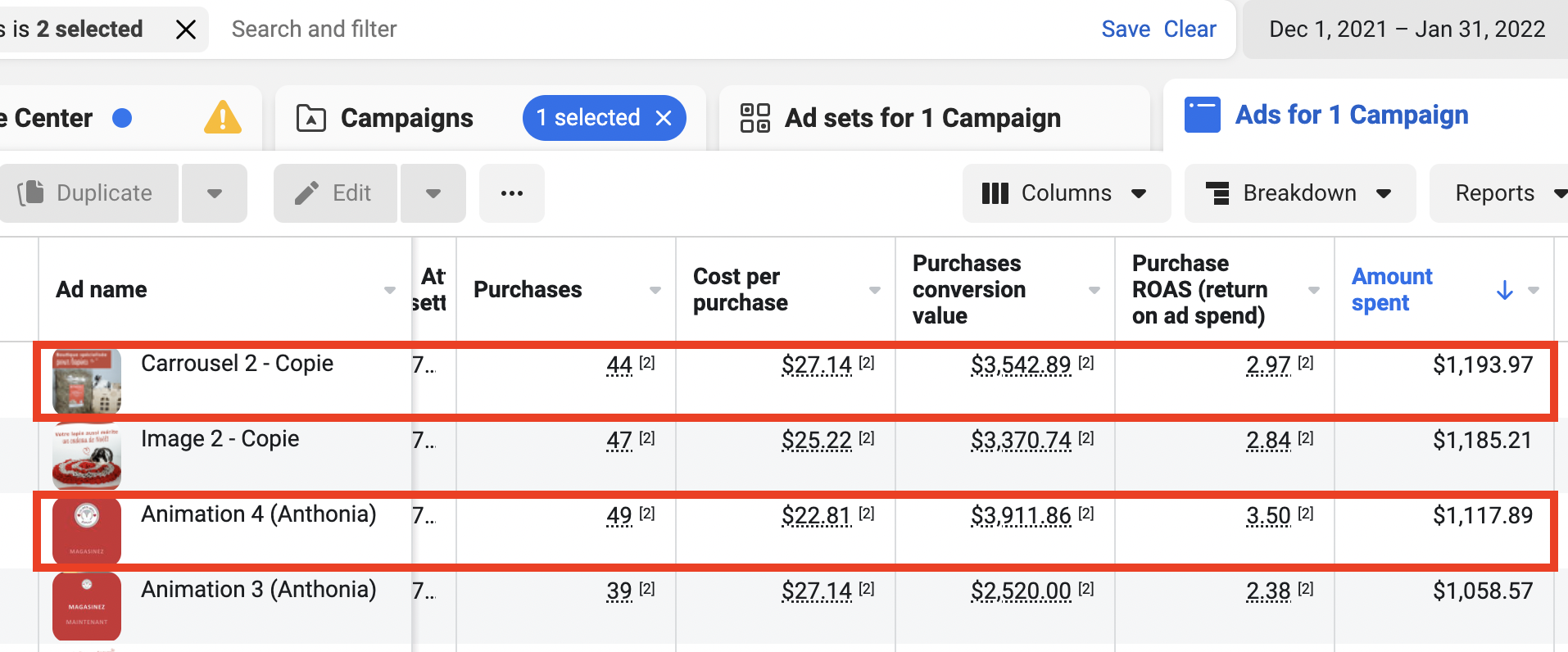 Dans cette campagne ABO, nous avions les deux mêmes audiences, avec le même budget. Les meilleurs produits avaient été sélectionnés pour nous assurer de vendre un minimum (nous testons une approche, pas le produit).