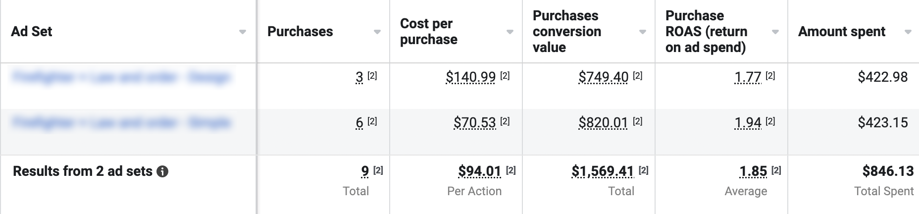 Retournement complet de la situation, les publicités simples convertissent bien plus que celles plus Design en volume, mais le retour sur investissement depuis Facebook est assez similaire en fin de compte.