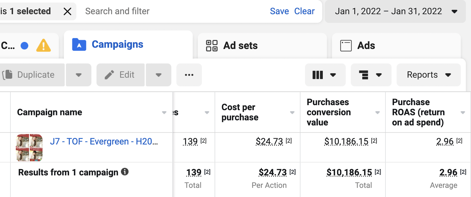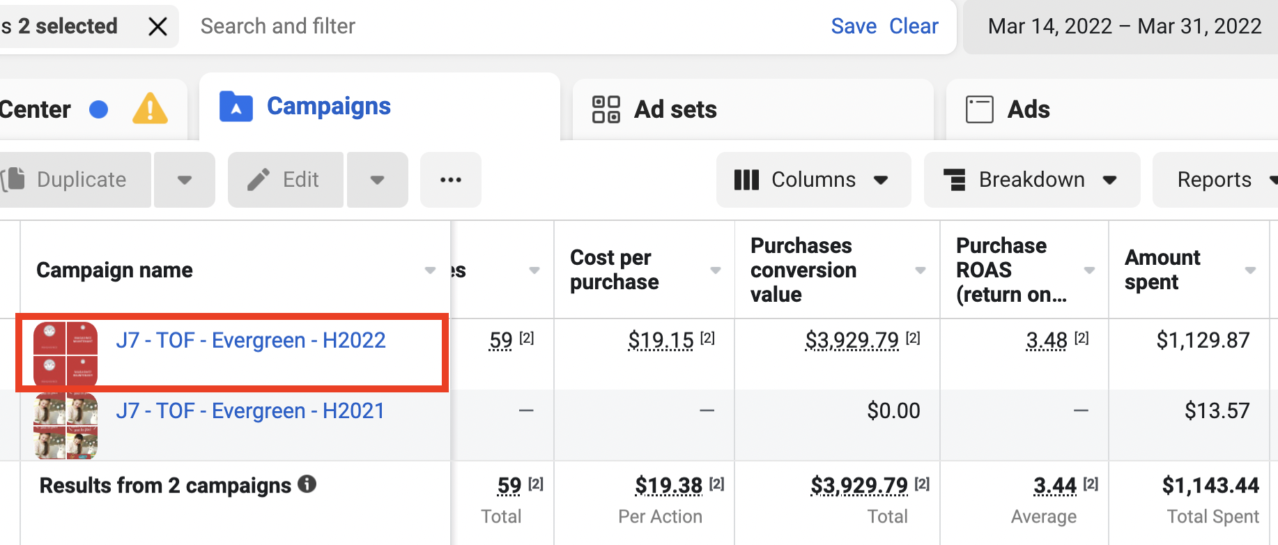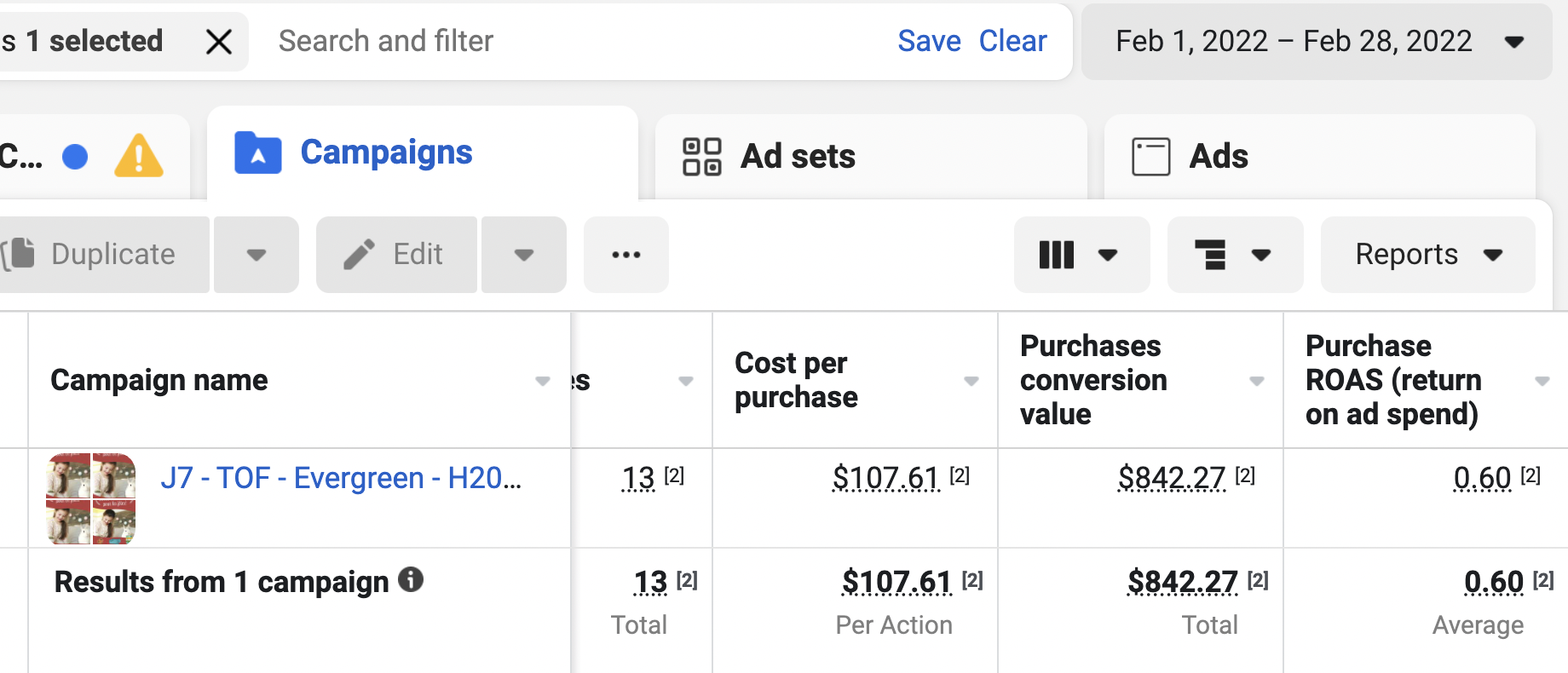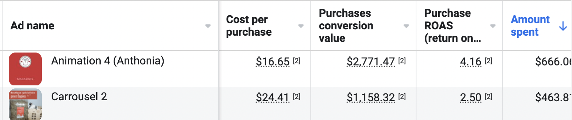 Notre test a été lancé à la mi-mars et voici ce qu’on peut trouver sur notre Ads Manager.