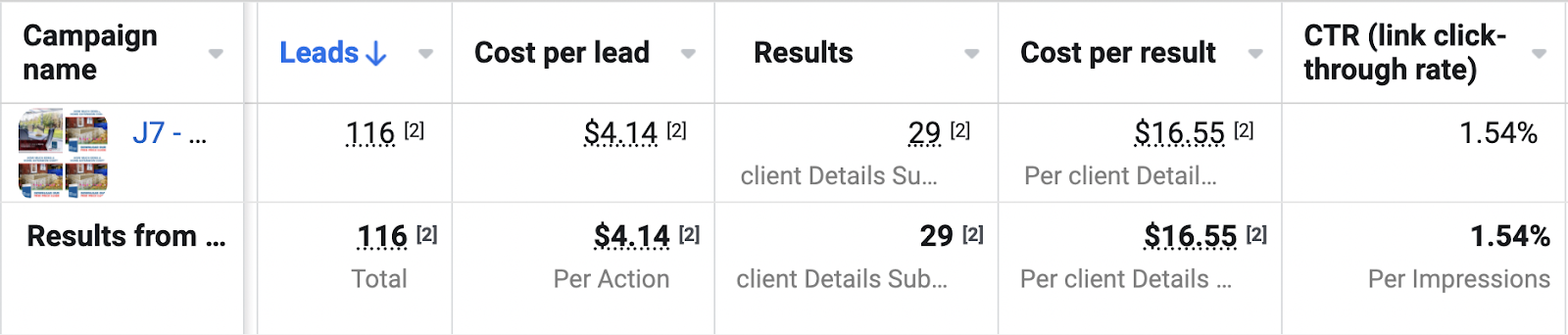 Traduction : on a beaucoup de leads sur le premier formulaire, mais sur le second, ça coince. Ce n’est donc pas un problème de publicité.