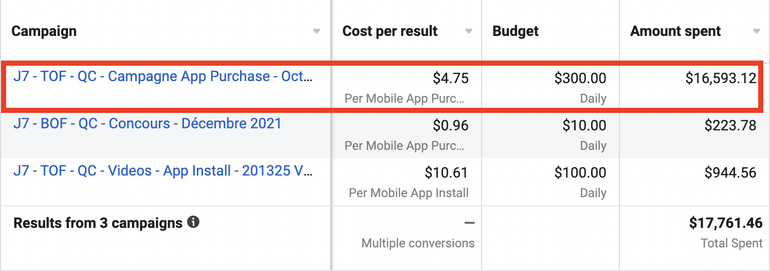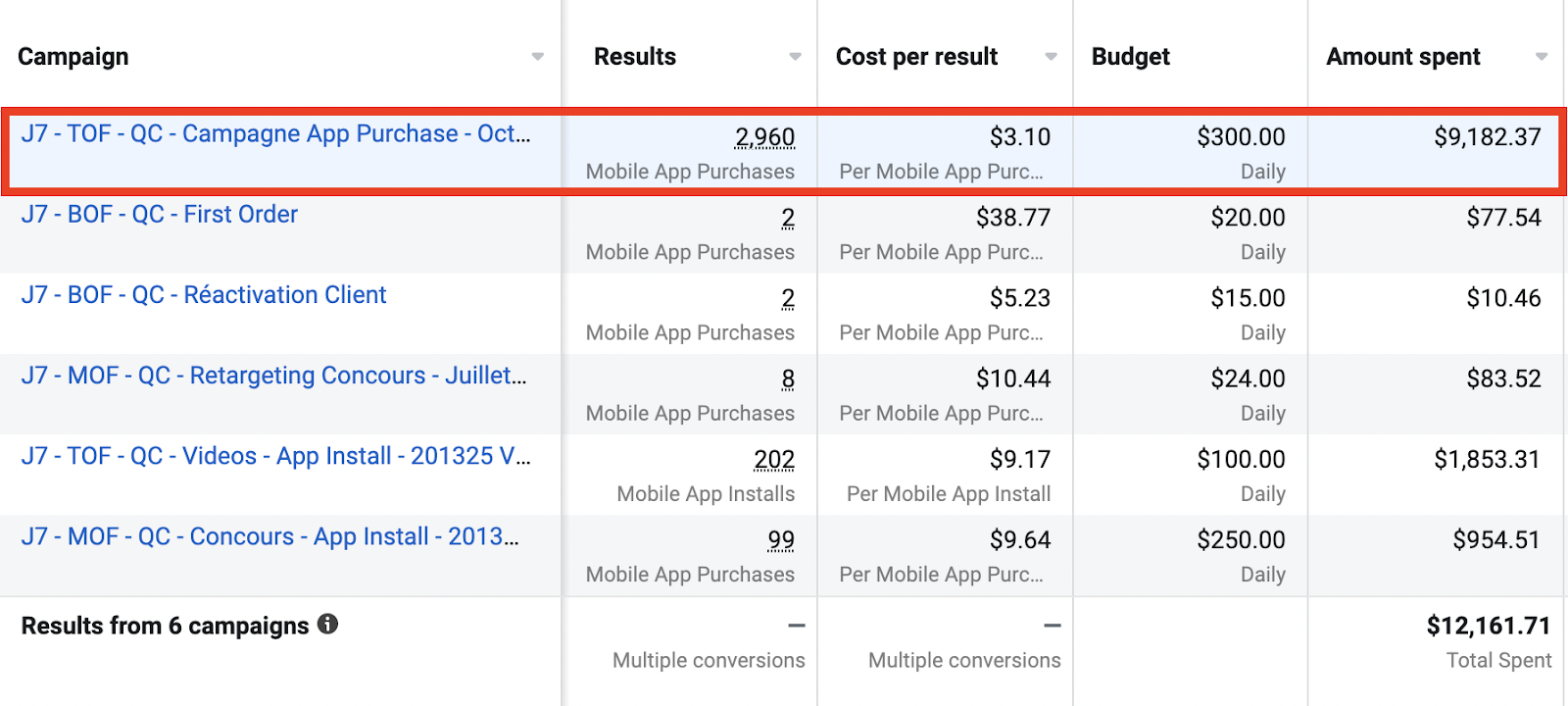 3,10$ l’achat sur l’application et on scale notre compte de 2 000$ grâce à cette nouvelle campagne. On arrête immédiatement toutes les autres campagnes pour garder uniquement celle-ci. Les deux mois suivants, voici nos résultats.