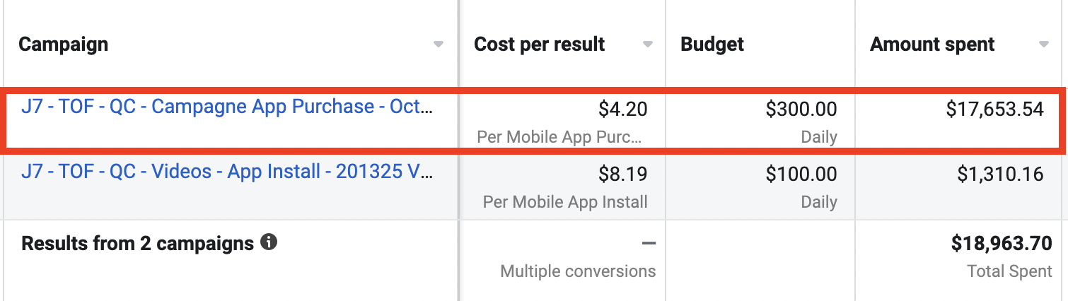 Le mois suivant, on fait un pari. Celui de laisser Facebook gérer et trouver ce dont on a vraiment besoin : des achats. Donc, on lance une nouvelle campagne TOF, mais cette fois qui optimise sur les achats depuis notre application.