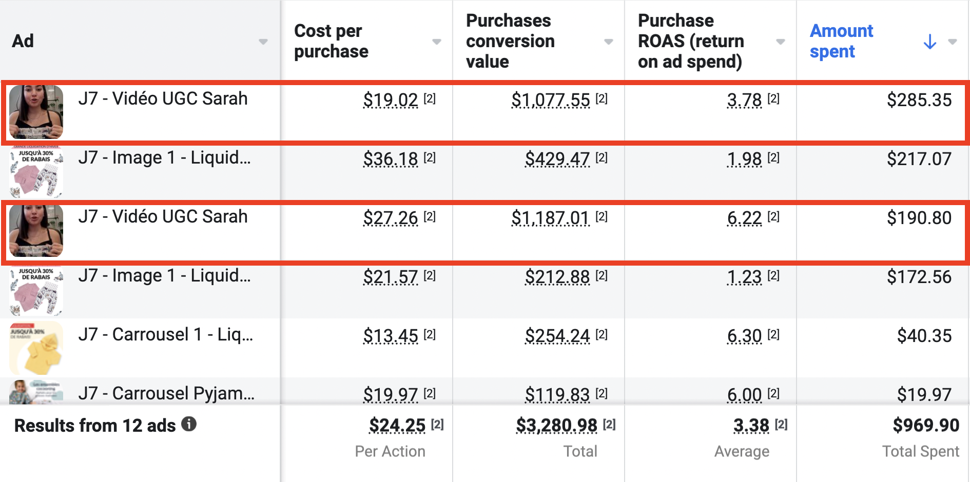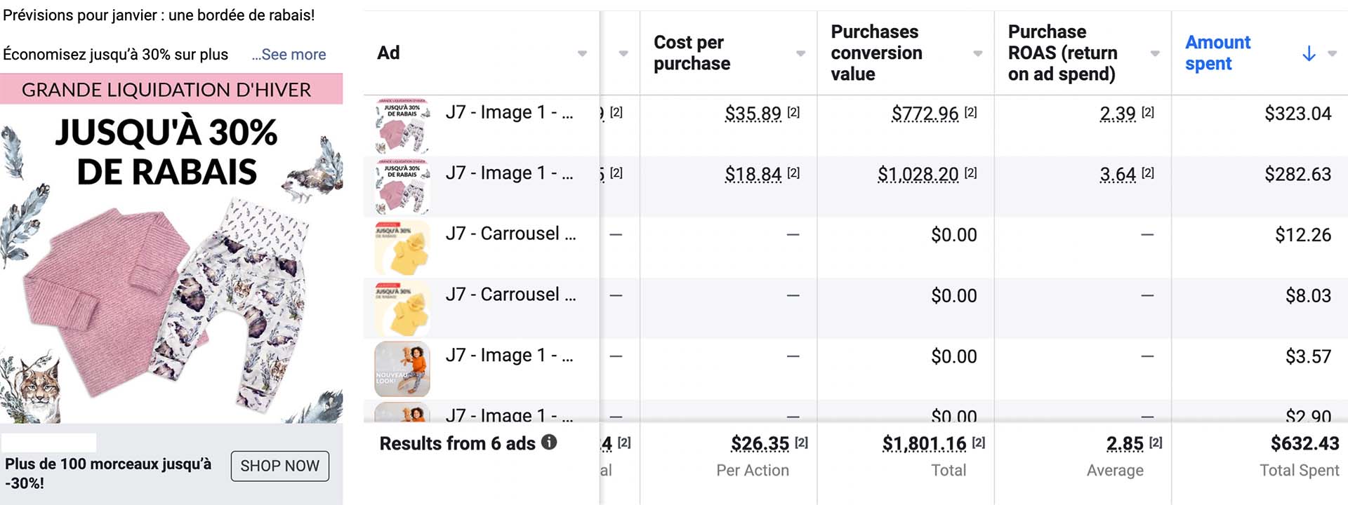 Le compte prend quasiment 6 000$ de dépenses sans dépasser le CPA cible. En plus, une joute implacable de créatifs se met en place. Le directeur de compte décline et continue d’utiliser des Hooks qui vont coller à la réalité de ses clients.