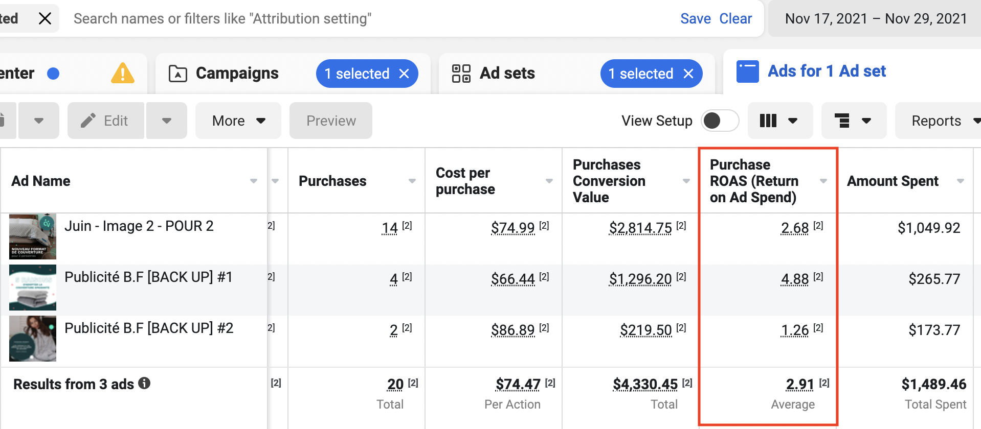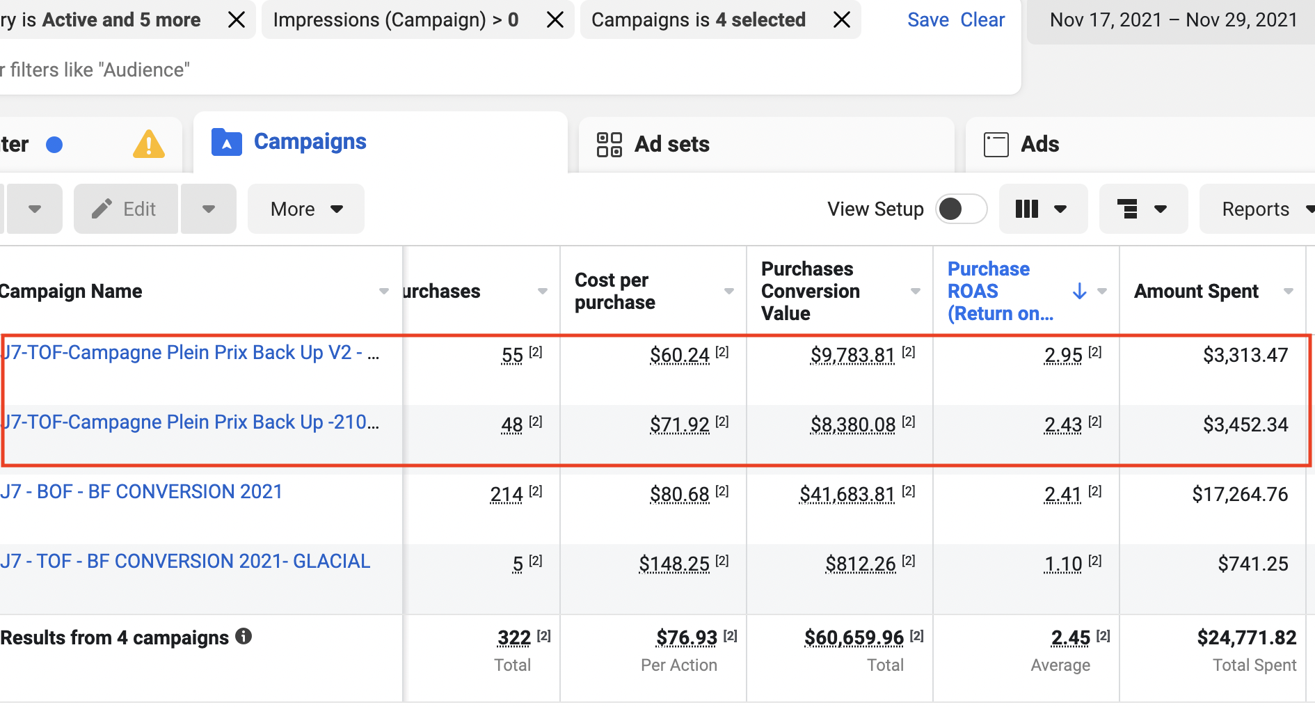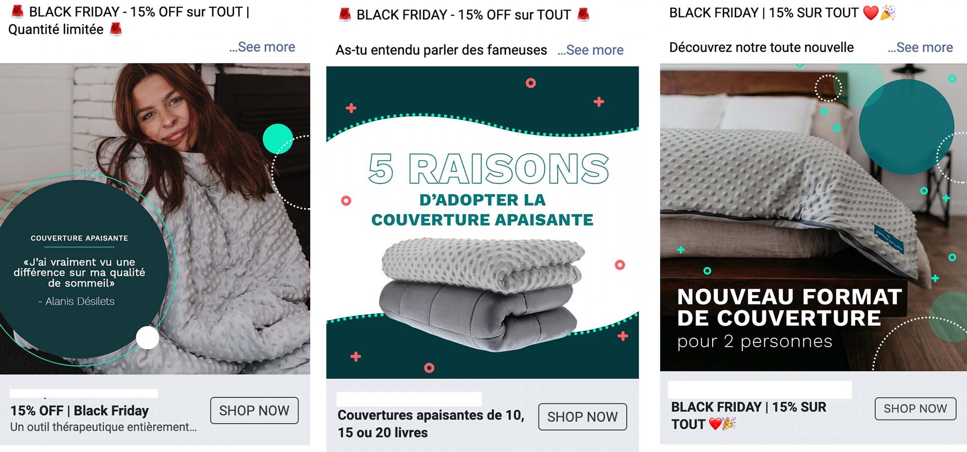 Ces deux campagnes « Back Up » sont composées, en majeure partie, de publicités evergreen qui n’étaient pas destinées au Black Friday. Et c’est parce qu’elles ont fonctionné dans le passé sur une audience froide que le directeur de compte les a utilisées à nouveau pour cette période!