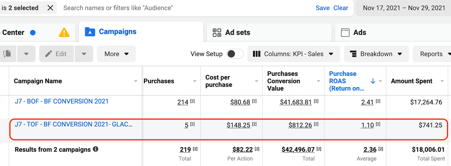 Sa TOF, comme on peut le voir, ne fonctionne pas du tout. 1,10 de ROAS après deux jours seulement, la campagne est coupée.