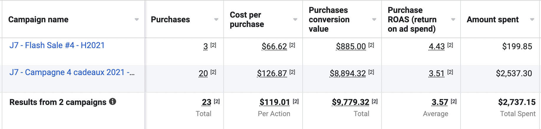 Sans trop faire d'efforts (en attendant la grosse période de promotion du Boxing Day), notre directrice de compte a pu générer quasiment 10 000$ avec un ROAS de 3,57.