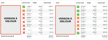 Voici un exemple très concret. Sur l’image suivante, à gauche, on observe une campagne de conversion en Lead avec, pour chaque audience, un budget de 10$/jour. Chacune de ces audiences détient une seule publicité, de sorte que le budget soit le même pour toutes les publicités. Sur la droite, on voit une campagne similaire avec les mêmes audiences, les mêmes publicités, la même offre, mais un budget de départ de 20$/jour. Pour info, le coût par lead (CPL) moyen sur ce compte est de 12$ à 14$.
