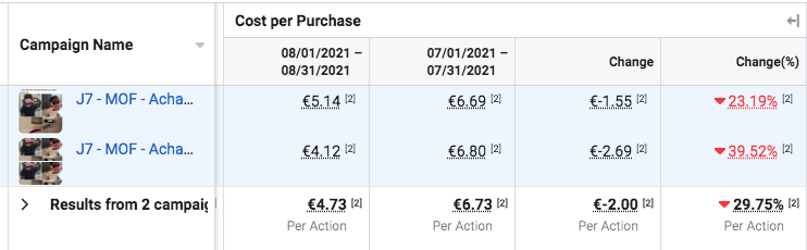 Car nous avons deux campagnes de retargeting et chacune a vu son CAC diminuer de 23% à 39% sur le mois. En moyenne, ces campagnes génèrent des achats pour un coût de 4,73€.