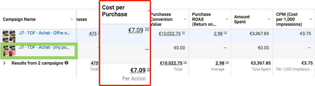 Mais restons sur Facebook pour en tirer une leçon. Parfois, l'algorithme a tellement d’expérience sur une publicité qu’il ne vous permet pas de tester, à moins d’avoir un budget supplémentaire sur une autre campagne, ce que tout le monde ne peut se permettre. Donc parfois, vous devez faire ce choix. Celui de couper cette meilleure publicité qui a un CPA qui augmente sans arrêt et qui empoisonne votre compte.
