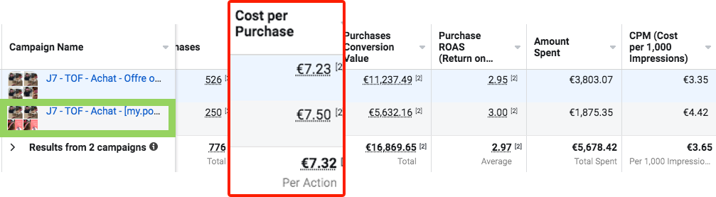 C’est-à-dire qu’avant, lorsque vous demandiez à voir les achats, le ROAS, le coût par achat, ce n’était pas possible d’avoir le total ou la moyenne à cause des attributions différentes. Et maintenant c’est le cas.