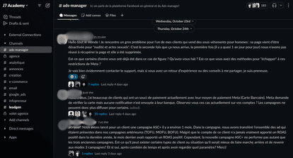 Pour pallier à ce problème, nous avons conçu un espace Slack qui donne accès à TOUS les employés de J7 Media (expert Facebook Ads, Google Ads, Copywriting, Création publicitaire, Tracking, E-mailing).